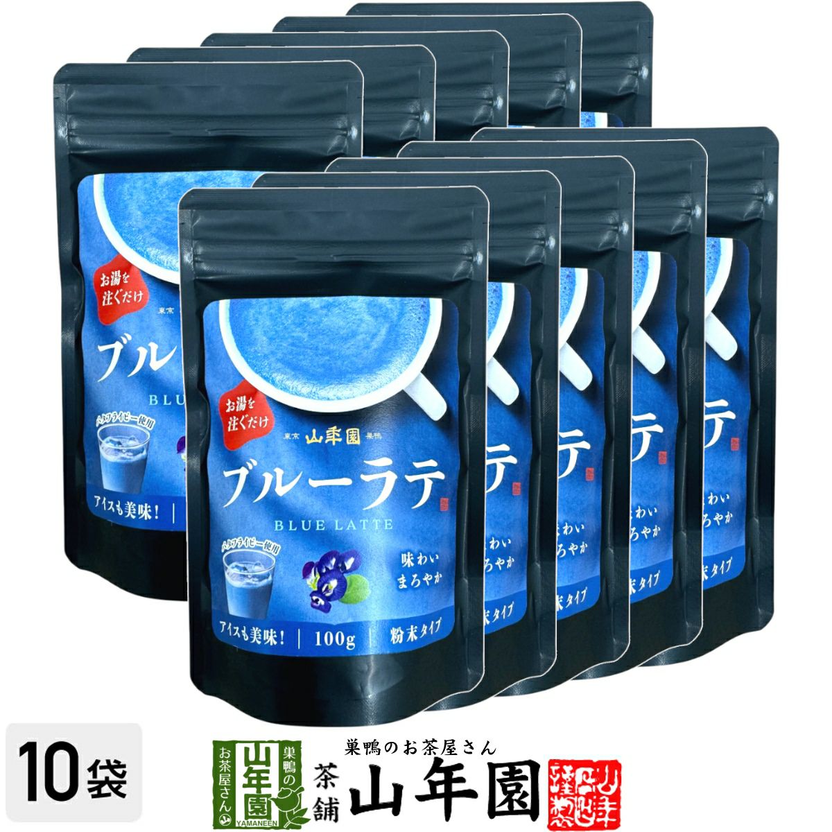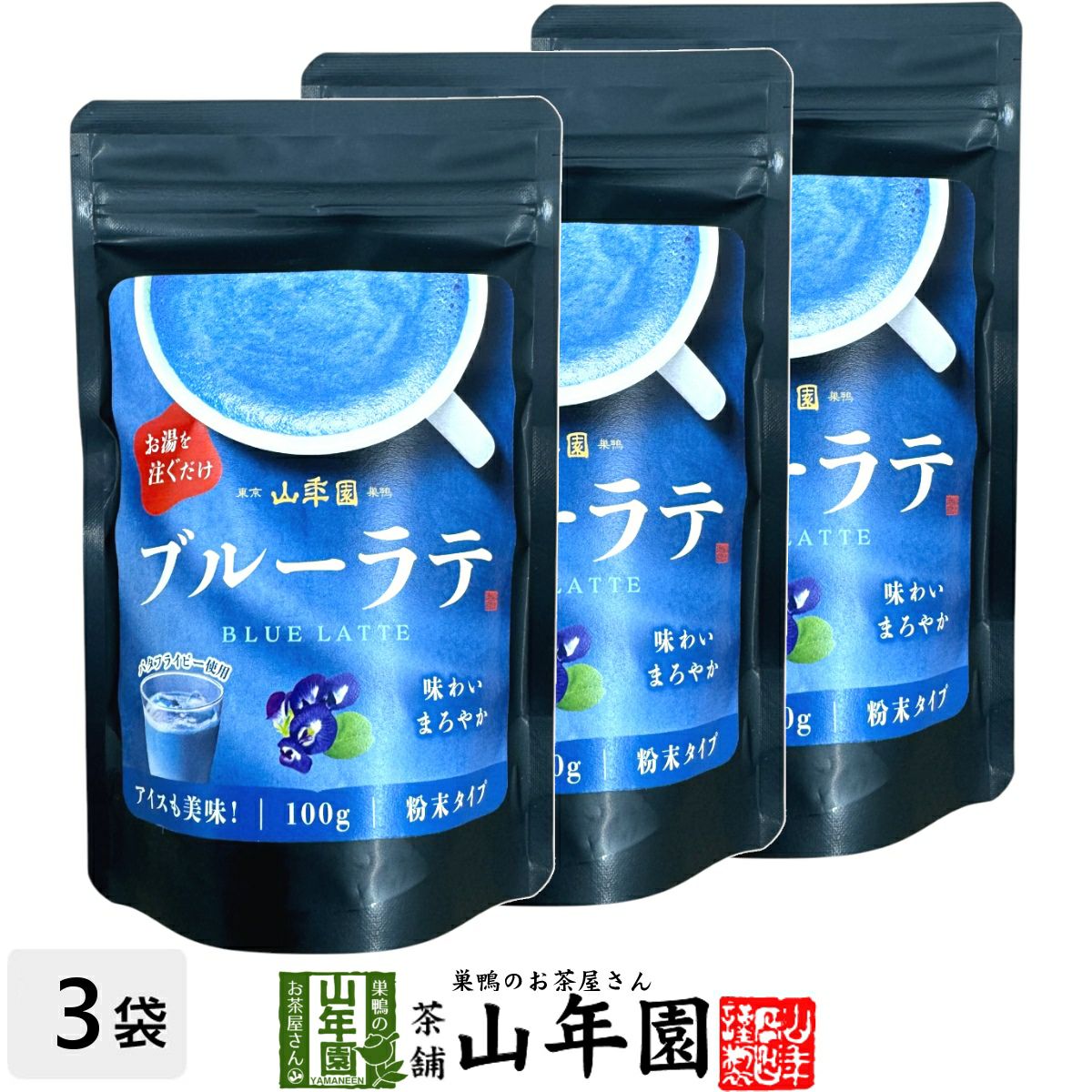 お湯を注ぐだけで簡単に作れる山年園オリジナルのブルーラテ