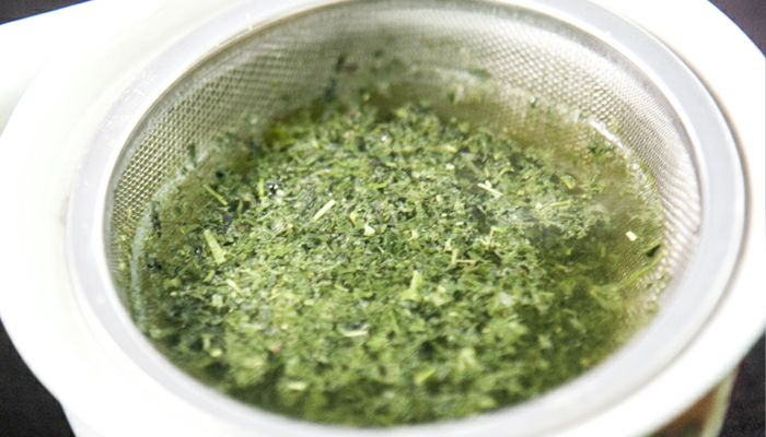 1.茶こしに約6~8g(ティースプーン約1杯)の茶葉を入れ、湯呑に置きます。