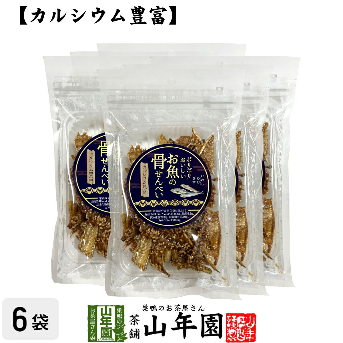 カルシウム豊富。いわし、あじ、きすの骨を乾燥させて焙煎し、甘辛く味付してせんべいに。パリッとした食感に仕上がっています。